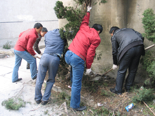 公司物料倉庫后沿的一行柏樹由于枝繁葉茂,在這次提前到來的大雪中不堪重荷,不少樹木橫臥走道,影響美觀,有礙出行。2009年11月30日下午,公司團委組織機關(guān)部分團員青年對被壓倒的柏樹進行一一扶植,并修整了門前綠化帶。