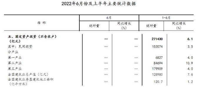 上半年,全國固定資產(chǎn)投資(不含農(nóng)戶)271430億元,同比增長6.1%。其中,民間固定資產(chǎn)投資153074億元,同比增長3.5%。從環(huán)比看,6月份固定資產(chǎn)投資(不含農(nóng)戶)增長0.95%。